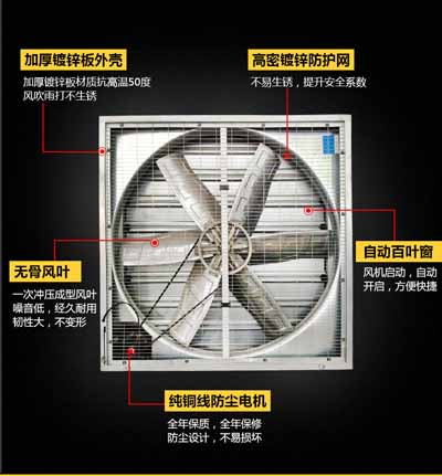 鍍鋅板式負壓風機也叫負壓抽風機,鐵皮風機及畜牧風機是蘇州速吉鍍鋅板抽風機在吸取同類產品優點的基礎上,開發研制的實用新型畜牧風機,該系列風機具有全壓低、風量大、噪音低、節能、運轉平穩、百葉窗自動啟閉、維修方便等特點。
